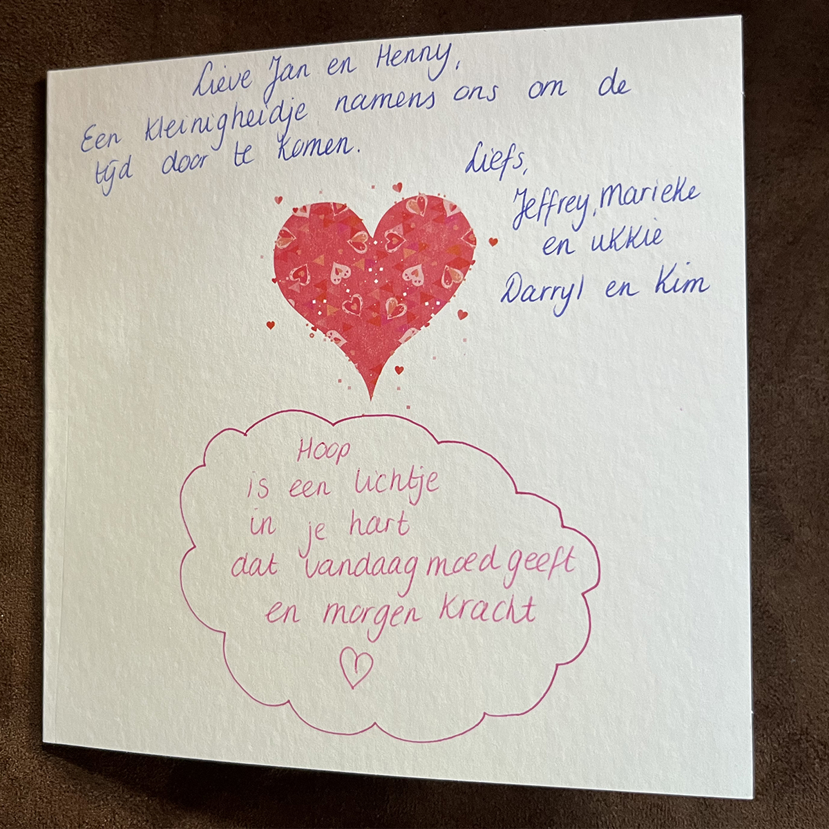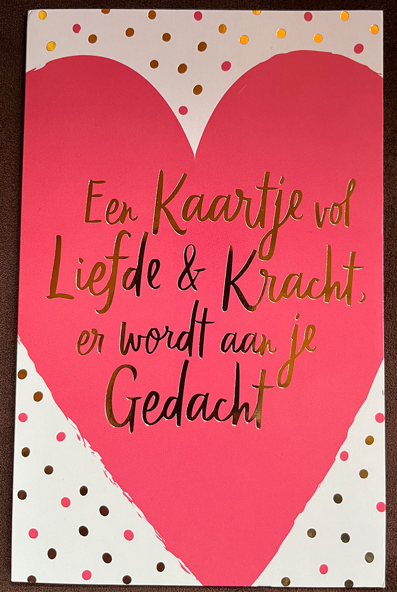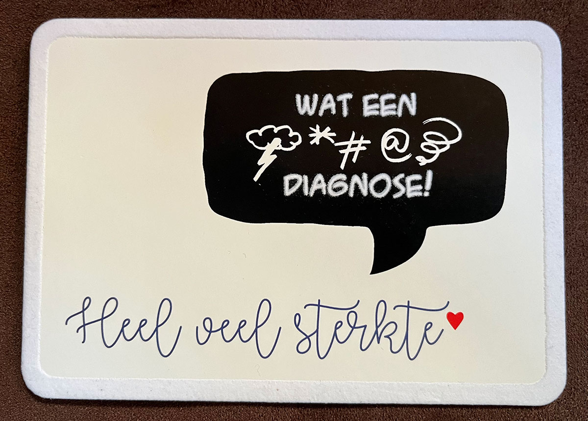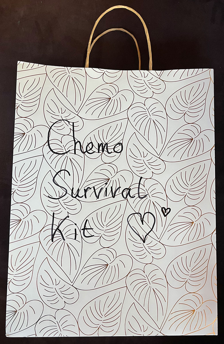 We ontvangen veel liefde van onze kinderen, schoondochters, familie, vrienden en kennissen. Soms in de vorm van een bloemetje, kaartje of schouder om op uit te huilen. Van de kinderen kregen we een origineel cadeau in de vorm van een ‘Chemo Survival Kit’. Hierin zaten o.a. boeken om de tijd tijdens de chemo door te komen.